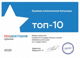 По итогам федеральной премии «ПРОДОКТОРОВ» за 2025 год Забайкальская краевая клиническая больница заняла заслуженное место среди лидеров медицинской отрасли региона. Рейтинг составлен на основании мнений пациентов, доверяющих профессионалам своё здоровье именно в стенах нашей клиники.